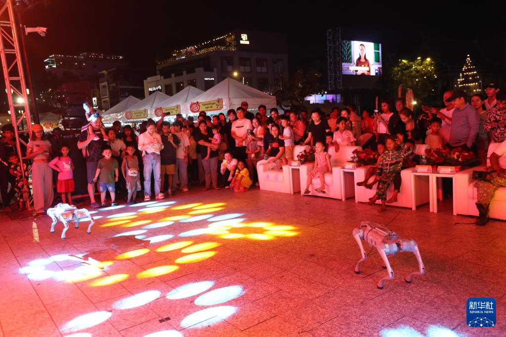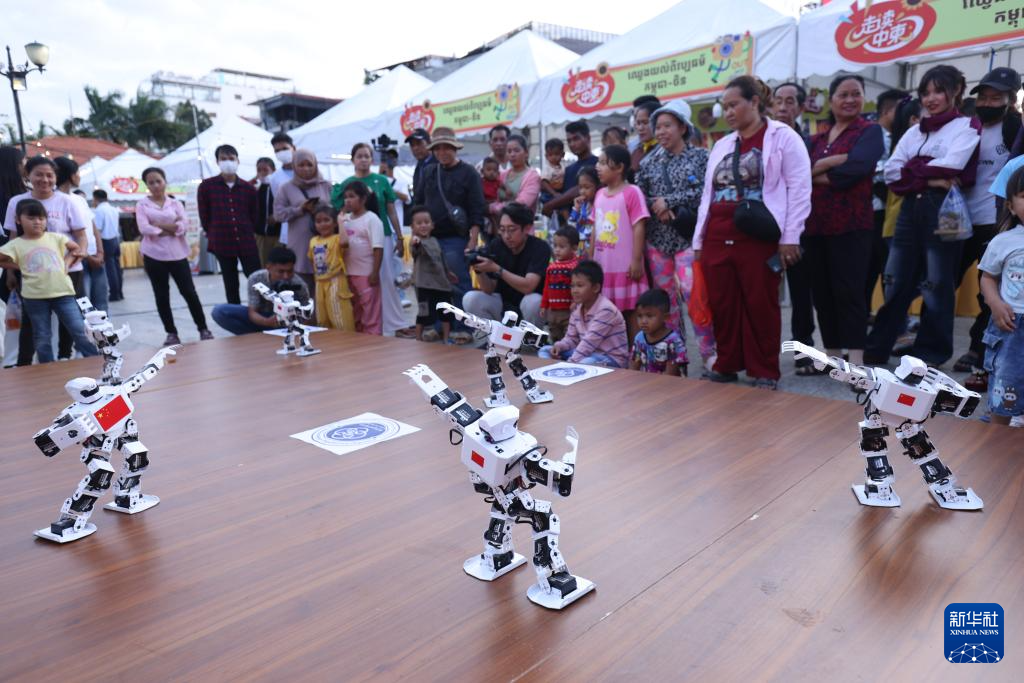 12月14日,在柬埔寨金边,人们在“走读中柬”系列文化活动文化市集上观看机器狗表演。
