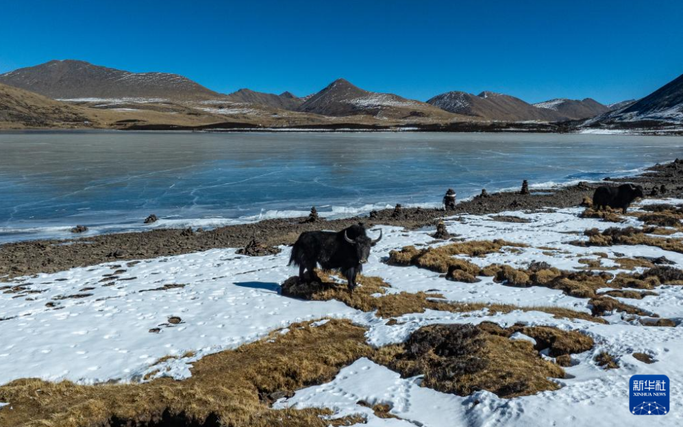 12月13日,牦牛驻足在思金拉错湖岸(无人机照片)。新华社记者 丁增尼达 摄