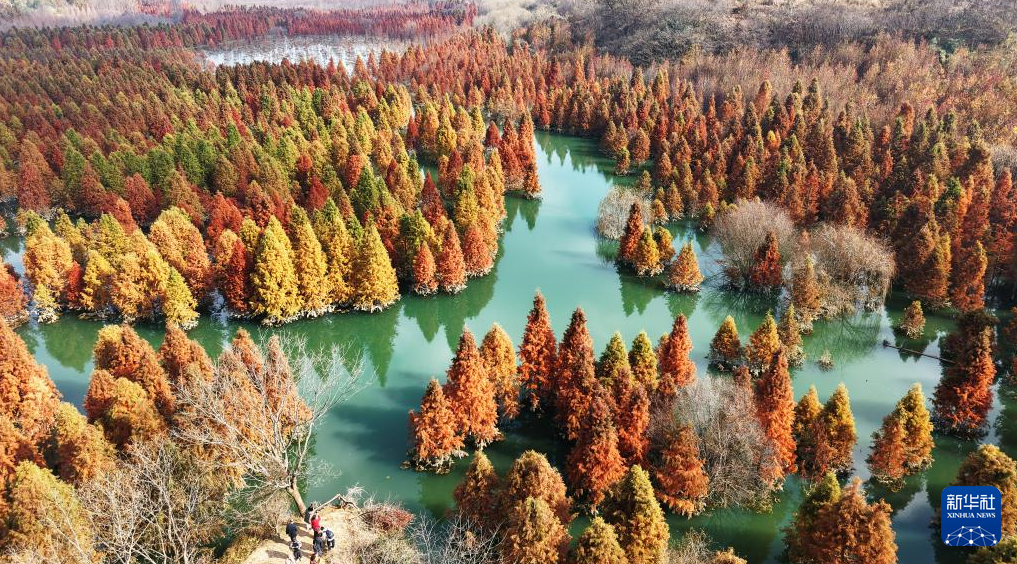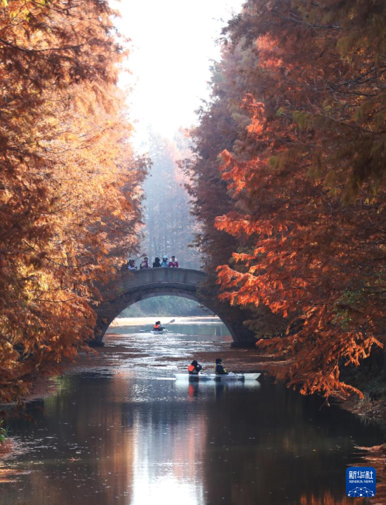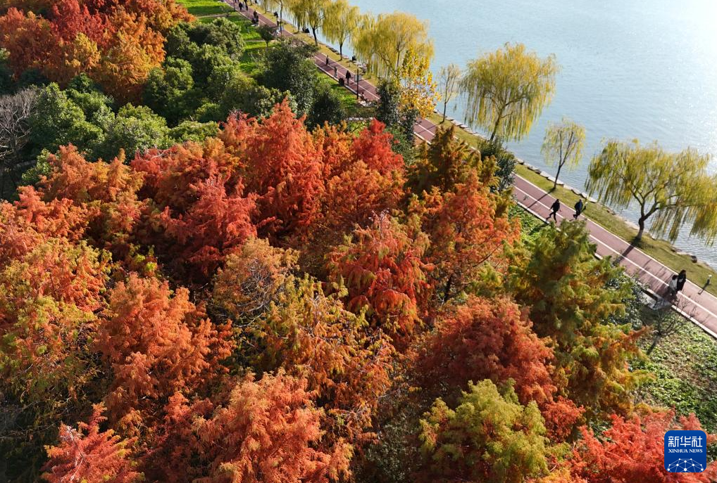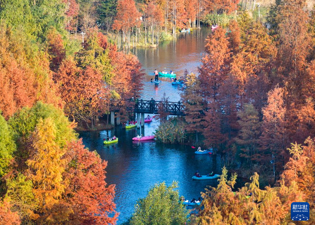 12月14日,游客在江苏常州红梅公园观赏枫叶美景。冬日时节,不少地方的红叶依旧绚丽,吸引人们游玩赏景。新华社发(王启明摄)
