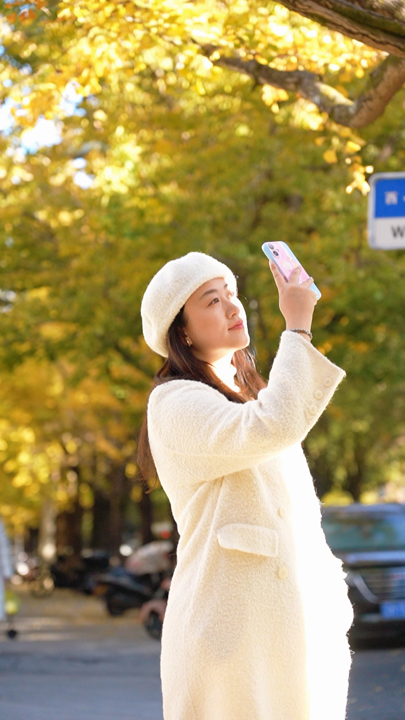 阳光慢慢爬上枝丫,穿过稀疏的叶片,在青灰色的墙面上投下细碎的金斑,暖得恰到好处,驱散了冬晨的微凉。此时适合穿米白色羊绒衫、浅驼色大衣或围巾,浅色系衣物与金黄银杏、青灰老墙相映,镜头里满是温柔的层次感,站在枝丫低垂处逆光拍摄,霜叶与光影交织,氛围感拉满。