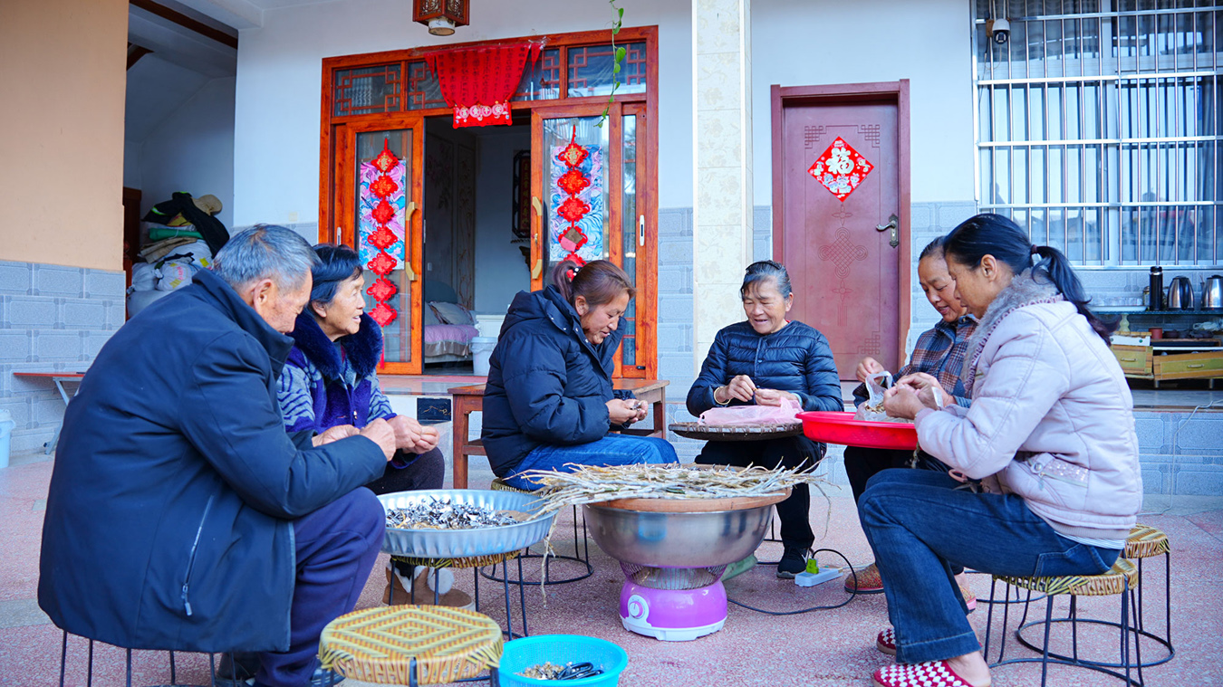 杨开菊(右一)与邻居一起加工石斛枫斗