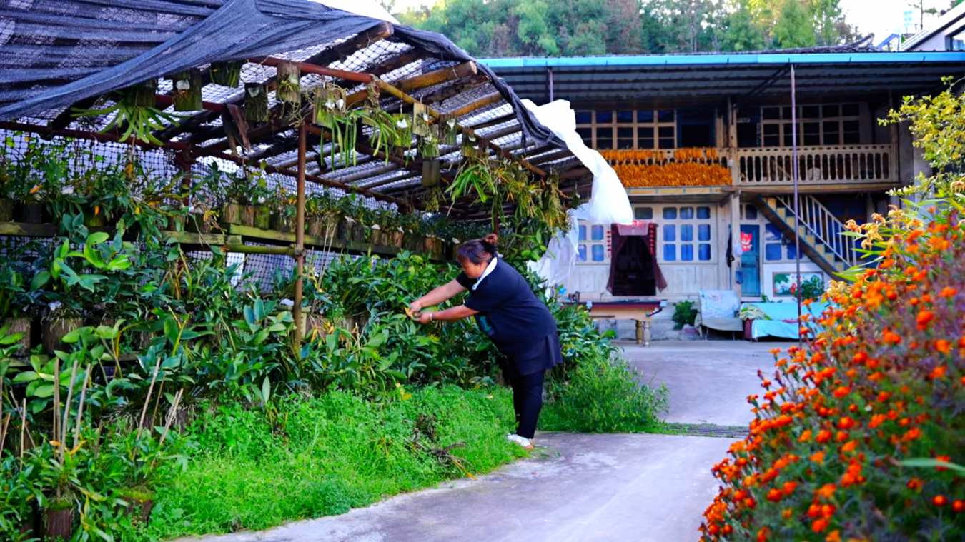 杨蓉梅在打理院里的石斛