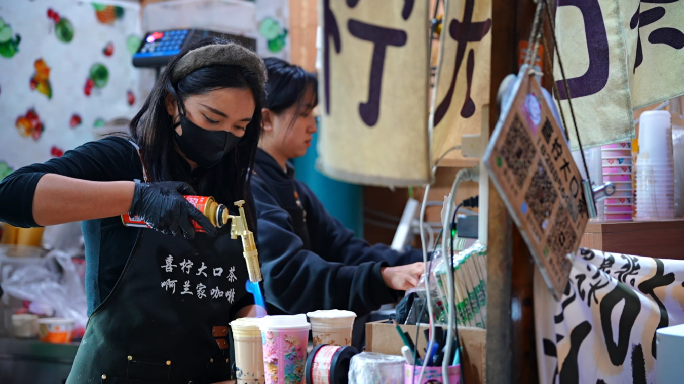 正在收摊的李继凤是最早到这里摆摊的人之一。她说:“奶茶、炒河粉、炒面、铁板鱿鱼等特色小吃很受欢迎,一天摆摊两个小时,能卖一两百块钱,逢年过节还能卖到四五百元。”