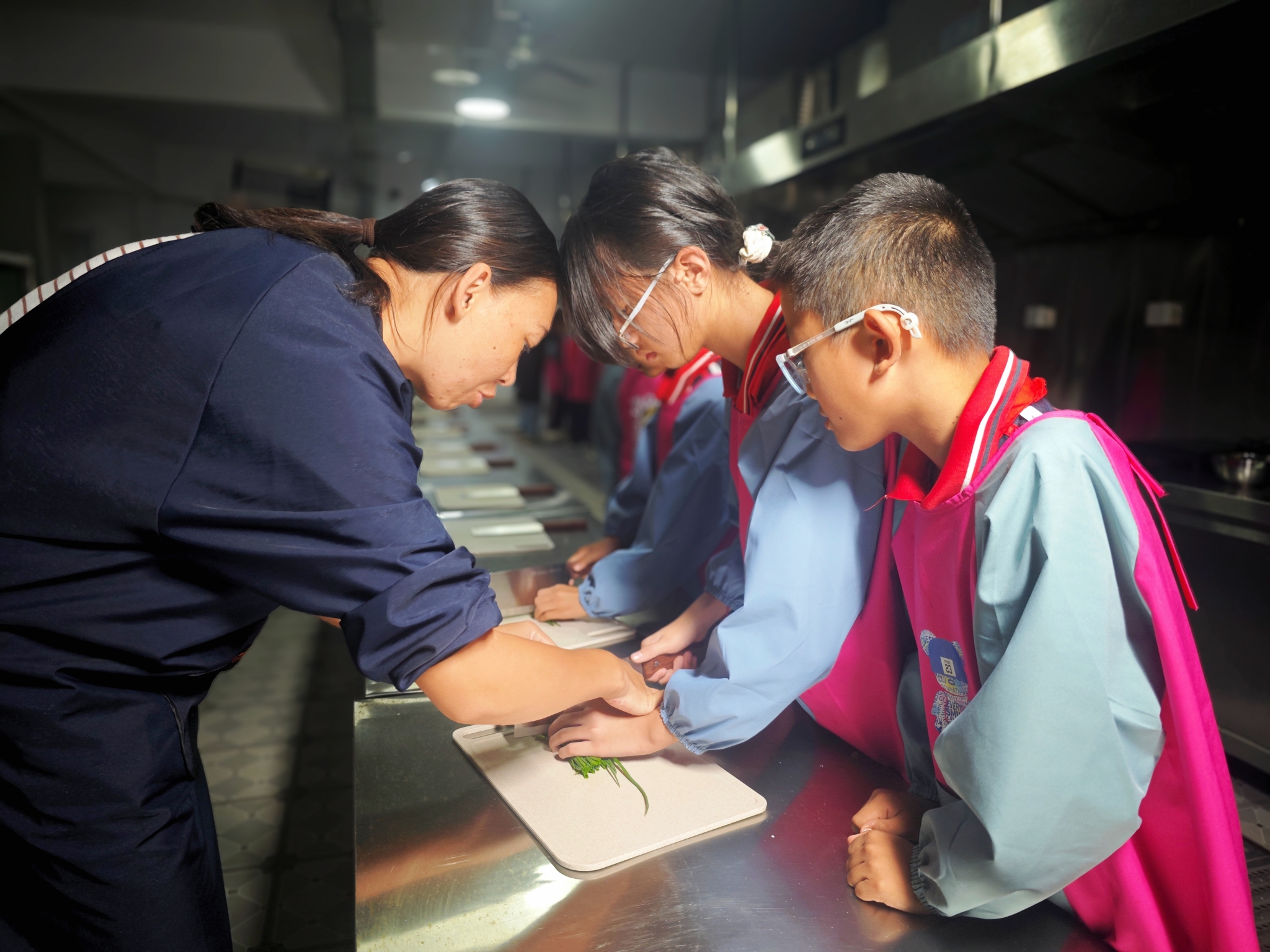 老师指导学生切菜。