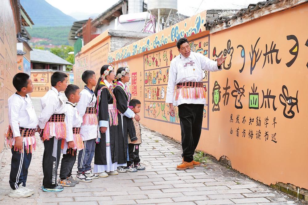 迪庆藏族自治州州级非物质文化遗产代表性传承人和树坤,以东巴壁画和千年古训为题,为三坝纳西族乡白地村的孩子们解读勤学、修身与家风建设的意义。云南日报 通讯员杨雪婷/摄)