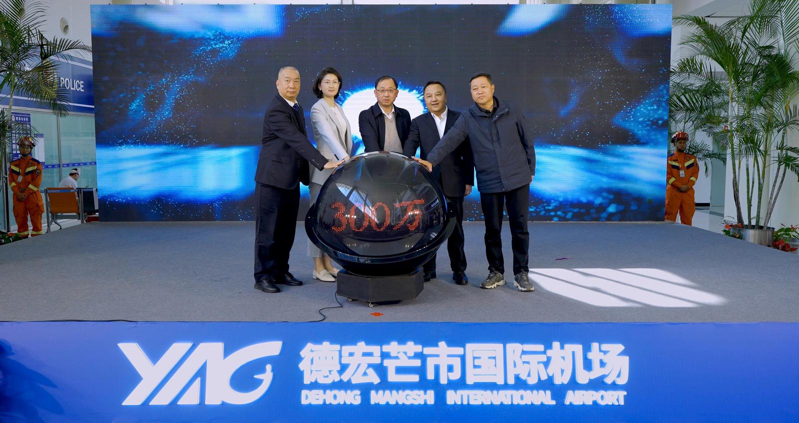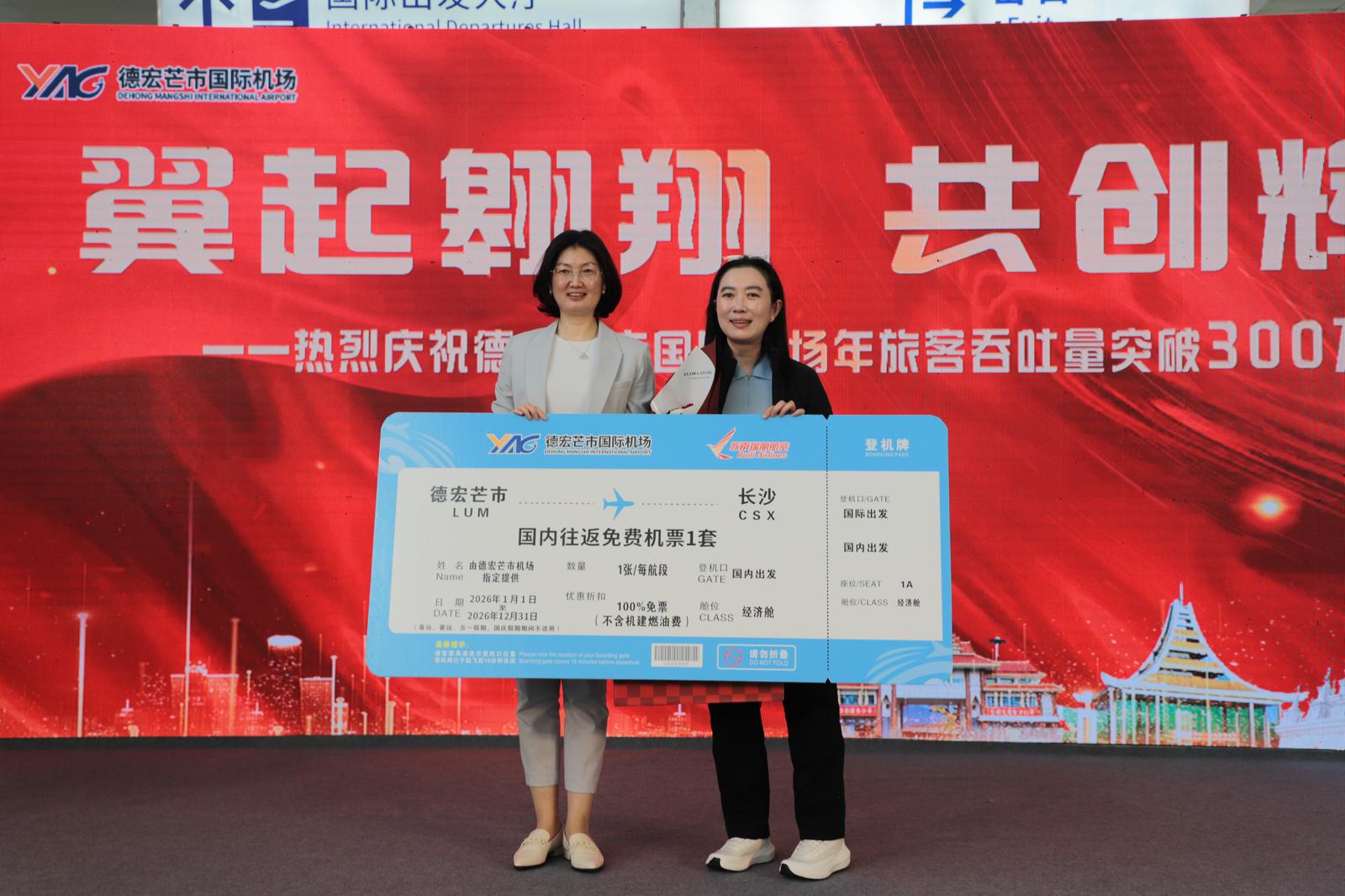 当日14时,“翼起翱翔 共创辉煌——庆祝德宏芒市国际机场年旅客吞吐量突破300万人次”主题活动在航站楼隆重举行。活动现场,与会领导为第300万名幸运旅客赠送免费机票,同航班旅客均获“300万纪念”专属纪念品,“300万·新征程”启动装置同步点亮,将现场气氛推向高潮。璀璨灯光既象征着芒市机场打造滇西次区域枢纽的新征程,也照亮了德宏对外开放的新图景。