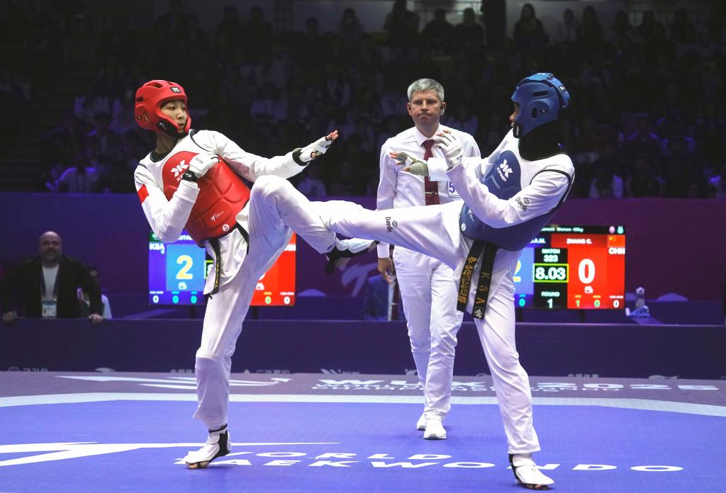 图为10月30日在江苏无锡举行的一场2025年世界跆拳道锦标赛比赛。新华社发(刘臻睿摄)