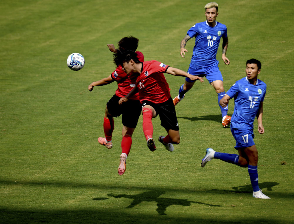 6月14日,球员在“苏超”淮安队对阵南京队的比赛中拼抢。新华社发(曹政 摄)