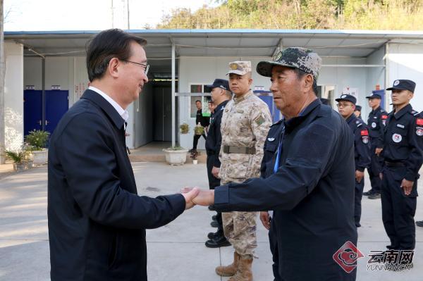 12月25日,王宁在瑞丽畹町镇新合村边境联防所,详细了解边境立体化防控情况,慰问党政军警民强边固防干部群众代表,与全国优秀界务员李洪刚等握手交谈。记者 雷桐苏 摄