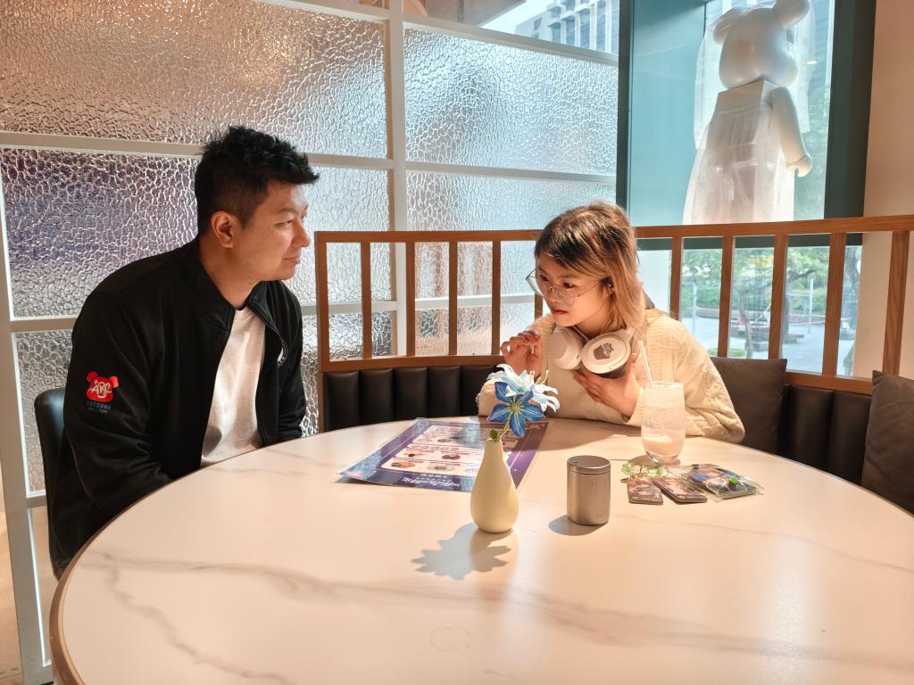 11月24日,刘承铭(左)在餐厅与食客交谈。刘承铭在香港尖东经营一家咖啡简餐厅,从2024年夏天开始承办游戏与动漫IP主题餐厅活动。新华社记者 刘英伦 摄