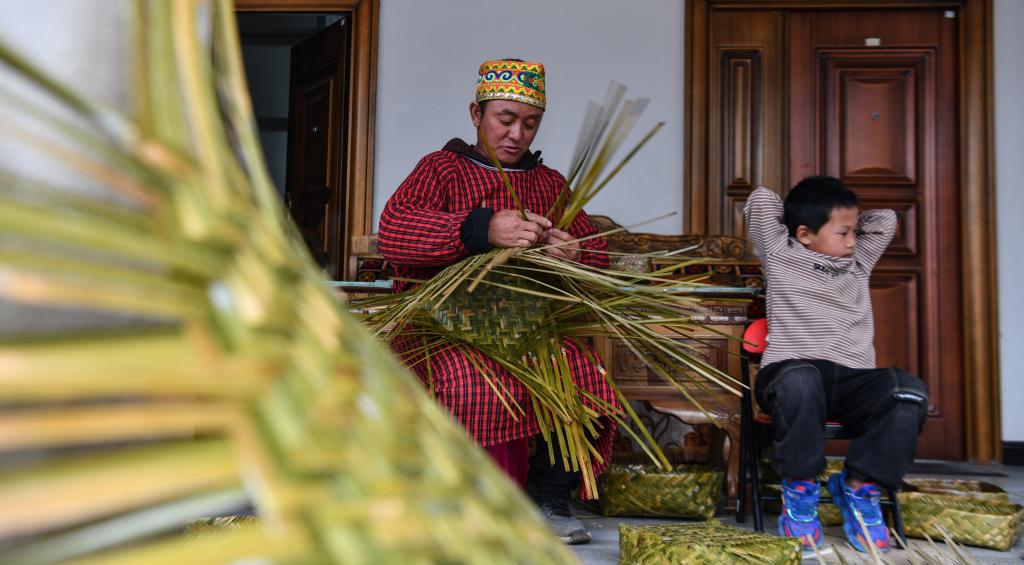 巴登村村民新向东在家编织竹筐(2022年4月15日摄)。新华社记者 晋美多吉 摄