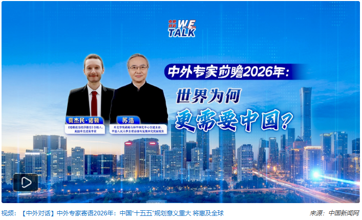 展望2026年的中国发展,中新网“中外对话”节目特邀外交学院战略与和平研究中心创建主任、中国人民大学全球治理与发展研究院副院长苏浩,《地缘政治经济报告》创始人、美国外交政策专家贲杰民·诺顿(Benjamin Norton),进行深度解读。