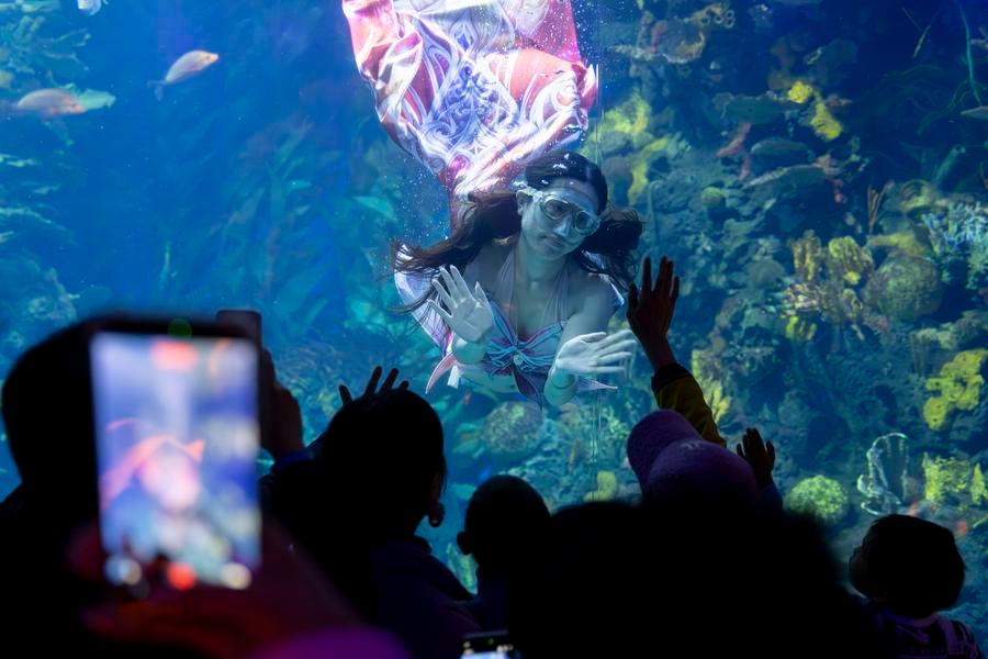A performer dressed in a mermaid costume greets visitors at an ocean park in east China's Shanghai on Jan. 1, 2026. (Xinhua/Wang Xiang)