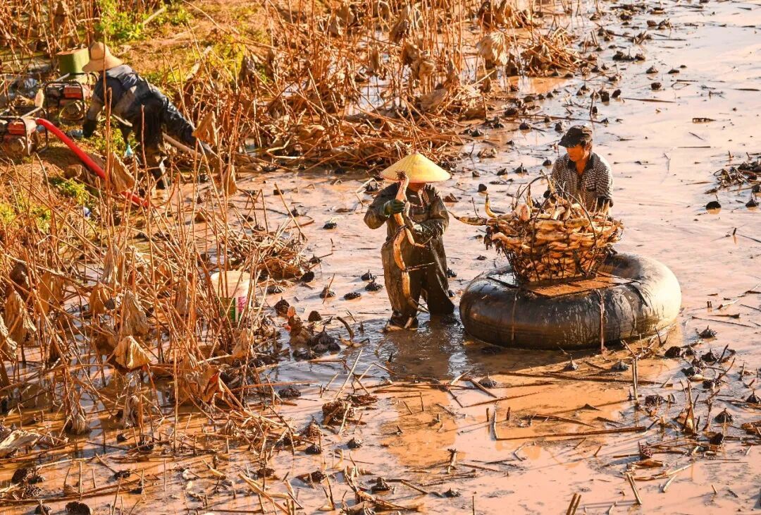 在千亩荷塘,藕农站在藕田里用高压水枪冲刷着淤泥,在荷塘的水面上,漂浮着几个大轮胎,它是采藕的运输工具,藕农将采好的藕小心地放置在轮胎上,然后借助水的浮力,用绳子拖着轮胎将藕运送到田埂上。