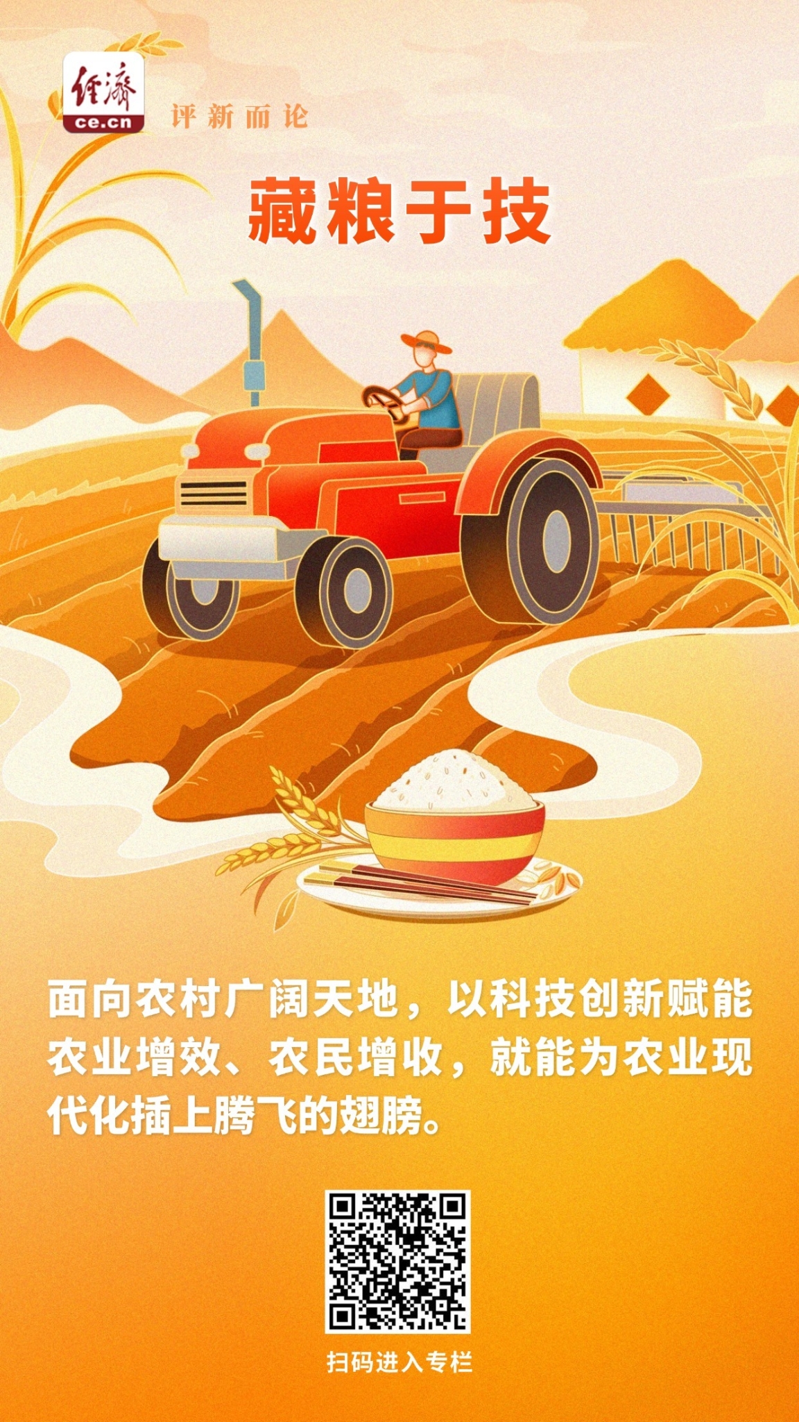 粮食安全是“国之大者”。从实验室的基因解码到田间的智能农业,以科技创新为引擎,积极延伸产业链条,必将为农业现代化注入更强动能,进一步筑牢大国粮仓。(中国经济网评论员 子房先生)