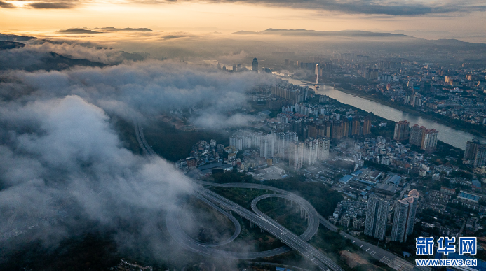在云南省西双版纳傣族自治州景洪市的南联山,黎明前的云海如乳白色的“绒毯”平铺舒展。当旭日初升时,云开雾散,城市的轮廓也逐渐清晰可见。这幅融汇了自然奇观与人间烟火的清晨画卷,辉煌而灵动。