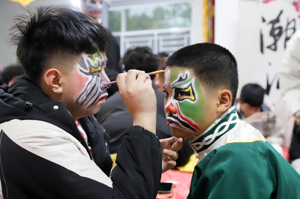 2025年1月29日,农历正月初一,在汕头潮阳区文光桃园英歌训练基地,英歌队员忙着化妆。