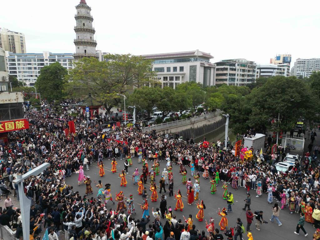 2025年2月2日,春节潮阳英歌嘉年华活动在文光塔火热上演(无人机照片)。