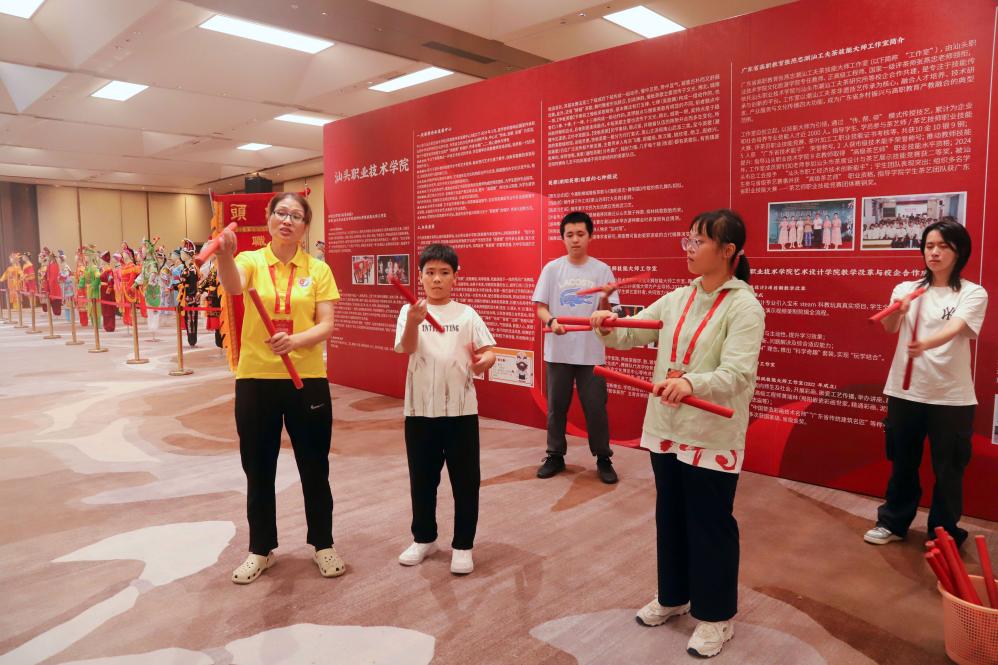 2025年10月3日,在汕头国际会展中心英歌舞非遗展示区,传承人(左)指导观众学习英歌舞步。