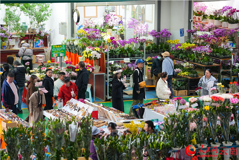 1月1日,新年伊始,暖阳高照,有着“亚洲花都”美誉的昆明斗南花市内花香四溢、笑语盈盈。数万市民和游客循着花香而来,在缤纷花海中选购鲜花、打卡特色景观、感受节日氛围,处处洋溢着新年的喜庆与活力。(人民网 记者李发兴)