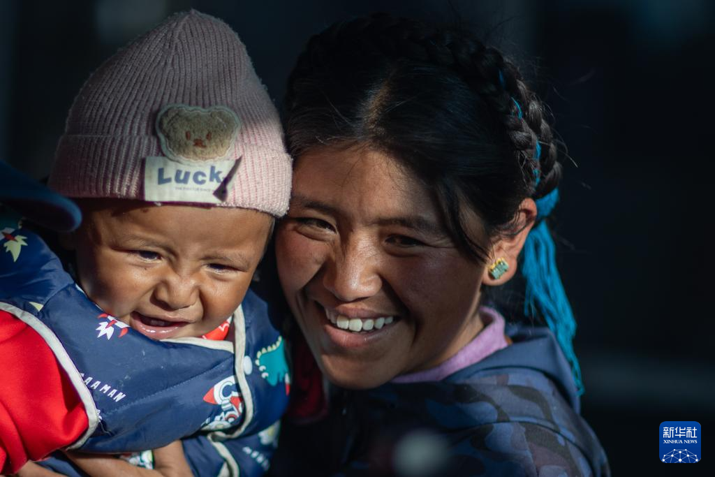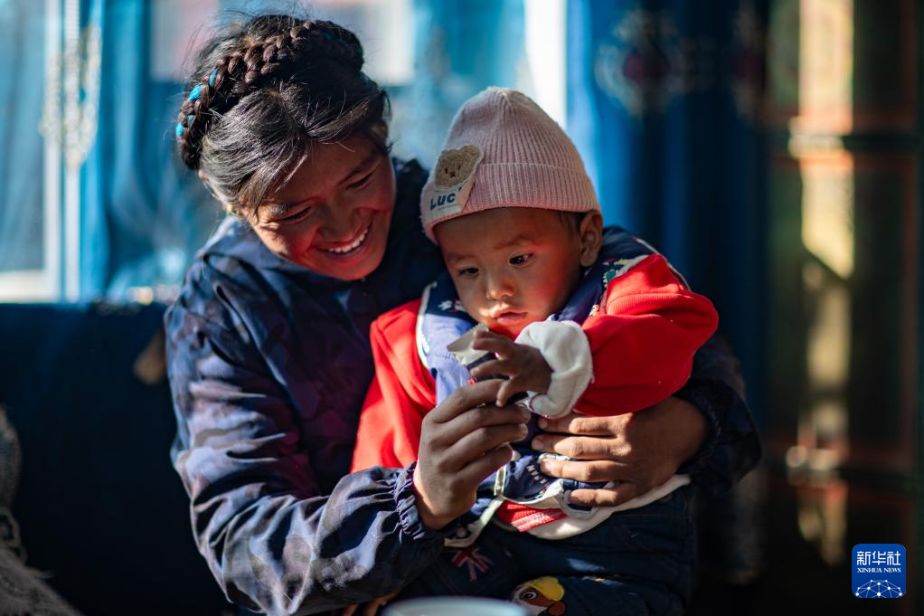 1月5日,在西藏定日县长所乡杂村,母亲朋琼在家中逗弄次仁拉巴。