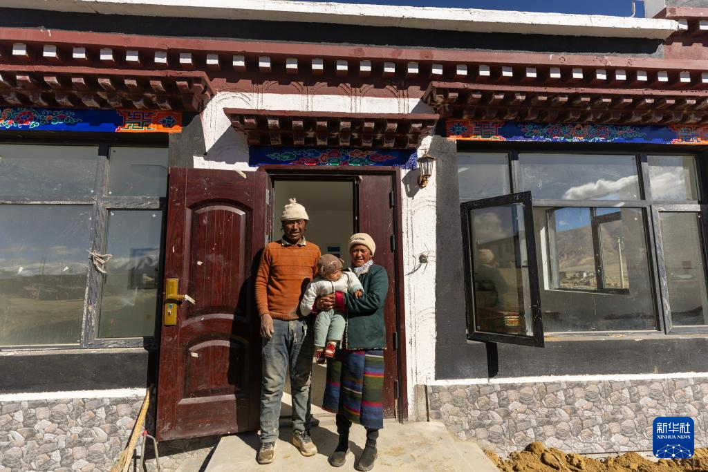 2025年10月24日,在西藏定日县长所乡杂村,外公米玛(左)、母亲朋琼和次仁拉巴在已交付的新房前合影。