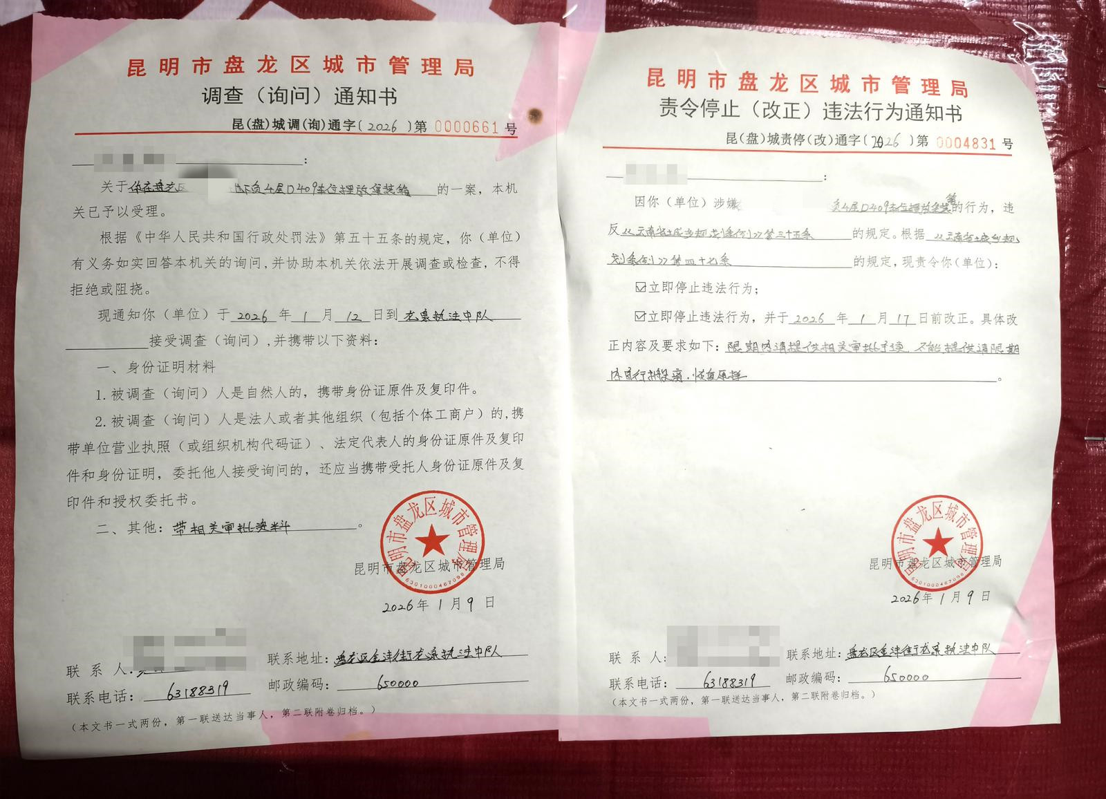 最引人注目的是,柜门正中央张贴着两份盖有红色公章的官方文书。一份是昆明市盘龙区城市管理局于2026年1月9日下达的《责令停止(改正)违法行为通知书》,另一份是《调查(询问)通知书》。