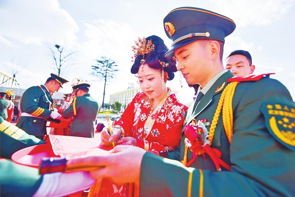 典礼上,新人们携手走过“幸福门”,“画眉”“合卺”“结发”等传统仪式依次进行。他们共饮取自珠江源头的清冽之水,寓意爱情如江水长流、永不止息。“我们自愿结为夫妻,谨守家庭责任……”10对新人许下铿锵誓言,激昂之声回荡营区,将婚礼推向高潮。
