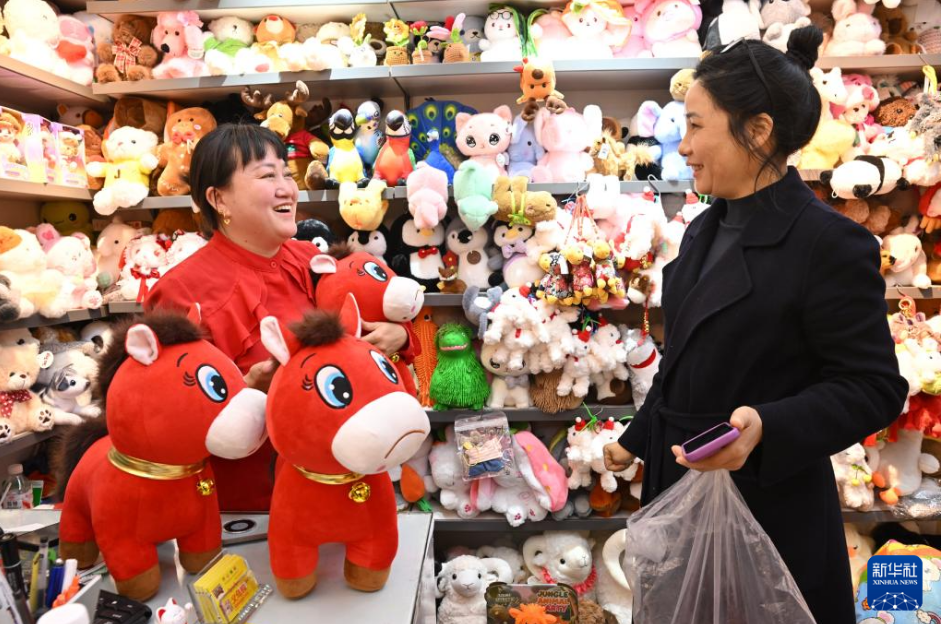 1月12日,在浙江义乌市国际商贸城一区玩具销售区,市场经营户“开心姐妹”负责人张火清展示销售的“哭哭马”小马公仔玩具。