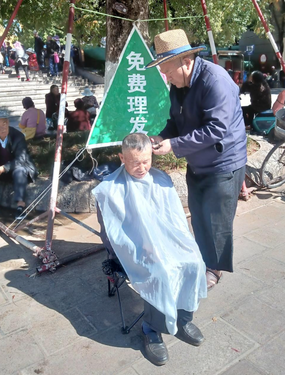 在石林县双龙广场,时间仿佛在每个周六下午1点30分,有了一个温暖的刻度。一把推剪、一把梳子、一件围布,58岁的县委党校教师李洪生,就在这里支起他的“周末课堂”。近三年来,风雨无阻,超过三千次的俯身与修剪,他用一把小小的理发剪,将“为人民服务”的讲台理念,化为街头巷尾最朴实的行动,成为街坊邻里口口相传的“头”等大事。