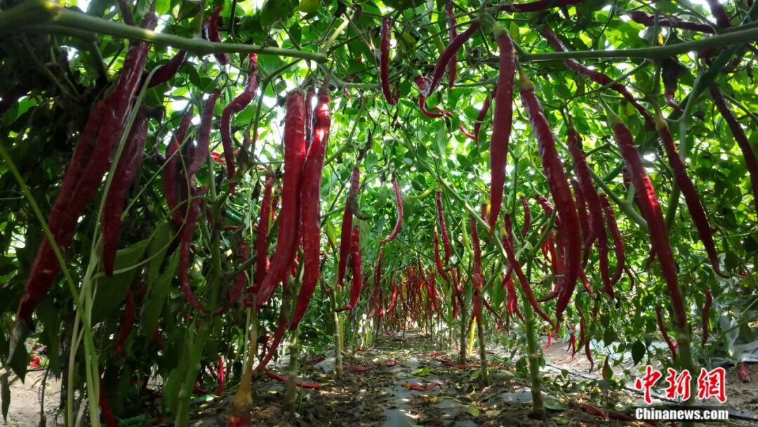 冀南平原上,连片的辣椒田如红色海洋翻涌——细长的羊角椒紧紧扒着枝头荡来荡去,油亮的皮肤晒得通红。
