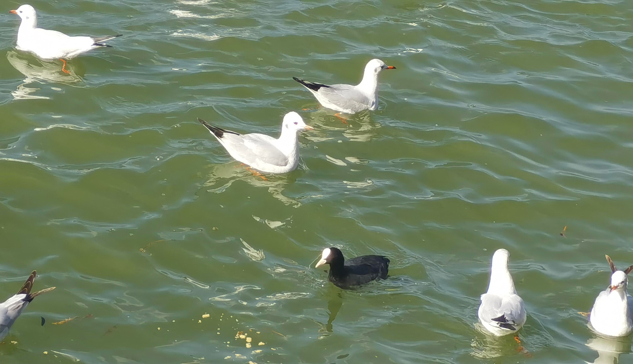 头顶一道白色的纹,全身黑色,不停地啄食鸥粮,与市民、游客熟悉的红嘴鸥一起在滇池水面享受冬日阳光……1月14日10时许,开屏新闻记者在昆明海洪湿地公园看到了滇池“常住鸟”——白骨顶。