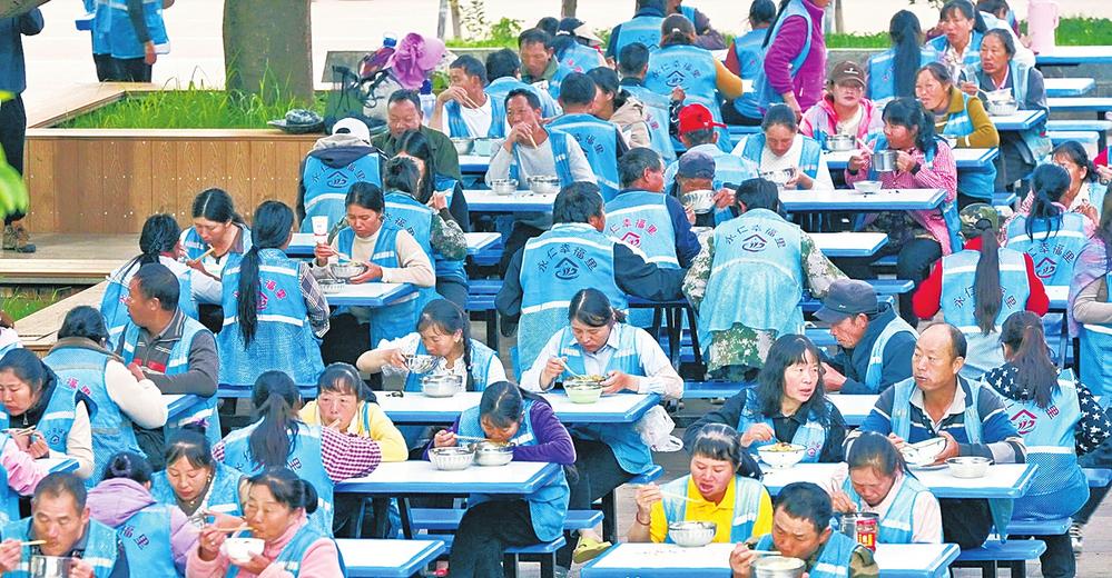 日落时分,永仁县莲池乡查利么村的希望小学飘出饭菜香气,前来打饭的工友有序排队,其中就有高文丽夫妇。多年前由招商银行援建的希望小学因撤点并校闲置已久,如今已被改造为“幸福里·产业工人社区”生活区,免费为务工人员解决住宿、就餐、洗浴、洗衣等后顾之忧。