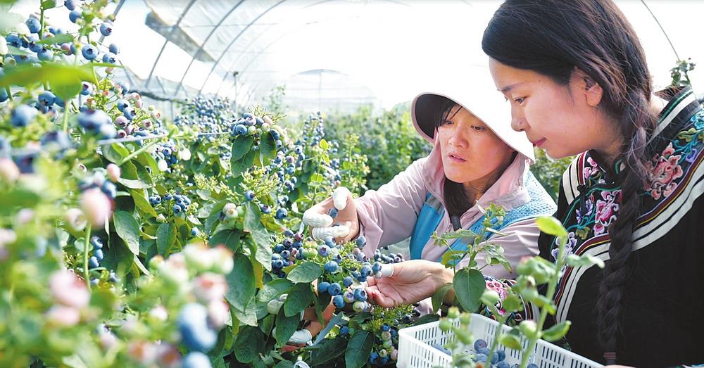 永仁县蓝莓现代农业产业园里,工人正在采摘蓝莓。