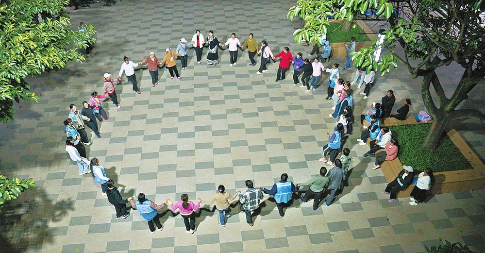 夜幕降临,忙了一天的工人们在“幸福里社区”跳起左脚舞。
