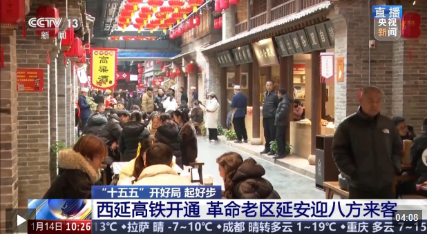 虽然今天是一个工作日,但可以看到街区里依然人流如织:一方面是因为这里本身足够有特色,将历史场景、非遗技艺、特色美食和互动演绎融为一体,游客可以在这里吃一碗热气腾腾的抿节、亲手体验陕北剪纸,又或者偶遇一场即兴演出,这些小巧思,让红色历史从静态陈列转化为可触摸、可参与的鲜活体验;当然另一方面还在于不远处的延安站为这里源源不断地输送客流,20天前,西延高铁的开通更是为这里的人气再添了一把火,乘坐高铁而来的散客和家庭游客明显增多。据统计,今年元旦假期,延安1938街区累计接待游客超1.7万人次,同比增长19.9%。