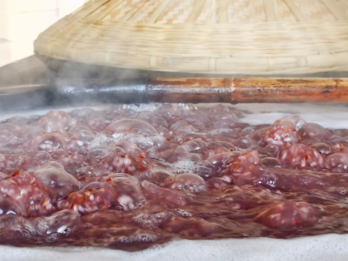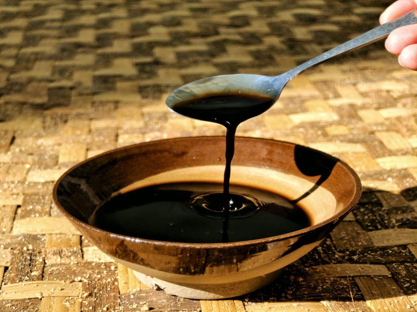 当缸中的酸香钻入鼻腔,便意味着可以转入下一道工序。将发酵好的醋曲移至另一口缸中,加入提前晒好的麦麸,微生物的又一轮“会议”就此开始。“温度要随季节调,冬天得助其升温,夏天则要帮着降温。”杨玉钦一边说着,一边用手翻搅着醋曲,动作熟练而轻缓。一天一夜之后,微生物“商量”出了结果。再经过滤、炒制糊米增添色泽,最后入大锅熬煮浓缩——至此,“土留麸醋”终于酿成。