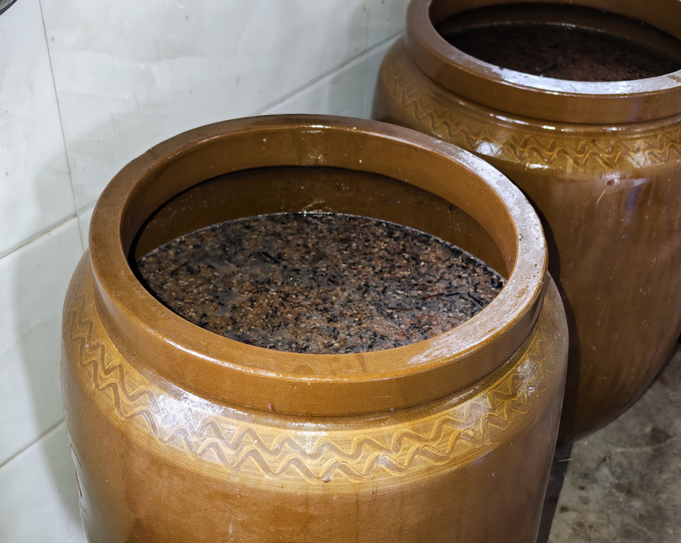 “百草曲”制成,真正的淬炼方才开始。需选用上好的红米熬煮,再以陶瓷大缸为窖池。缸体置于常沐阳光的墙下,既隔绝地气又防止杂菌。随后,将熬烂的红米与百草曲仔细拌匀后入窖发酵,其间温度的微妙变化,全凭老师傅的掌心感知。“靠尝、靠闻,发酵到哪一步,都是根据多年攒下的经验来的。”杨玉钦说。