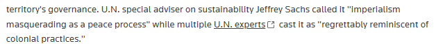 文章强调,多位联合国专家认为该方案“令人遗憾地让人想起殖民主义做法”。联合国秘书长原特别顾问杰弗里·萨克斯(Jeffrey Sachs)等多位学者直指其为“伪装成和平进程的帝国主义”。