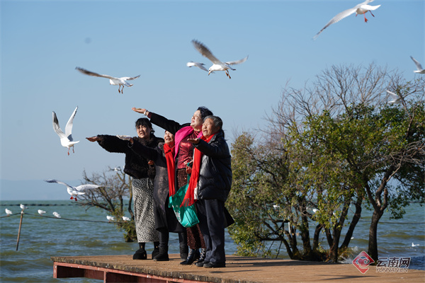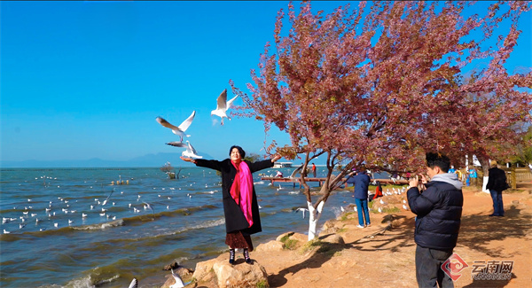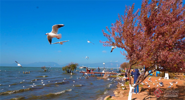 这里不仅是摄影爱好者捕捉美好的天堂,也让人们切身感受到人与自然和谐共处的温馨场景。成群的红嘴鸥在湖畔嬉戏觅食,游客在樱花树下驻足流连,共同构成了冬春之交春城最温暖而富有诗意的风景。
