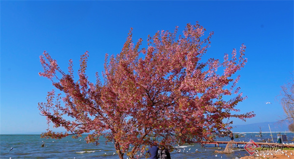 近日,位于昆明市官渡区王官湿地的数株冬樱花悄然盛放,因其临水而立的独特景致,迅速成为本地市民与游客争相造访的拍照胜地。其中最引人注目的,是一株被誉为“距离滇池最近的樱花”,它独立水岸,与滇池湖光相映,宛若一幅“面朝大海,春暖花开”的生动画卷。