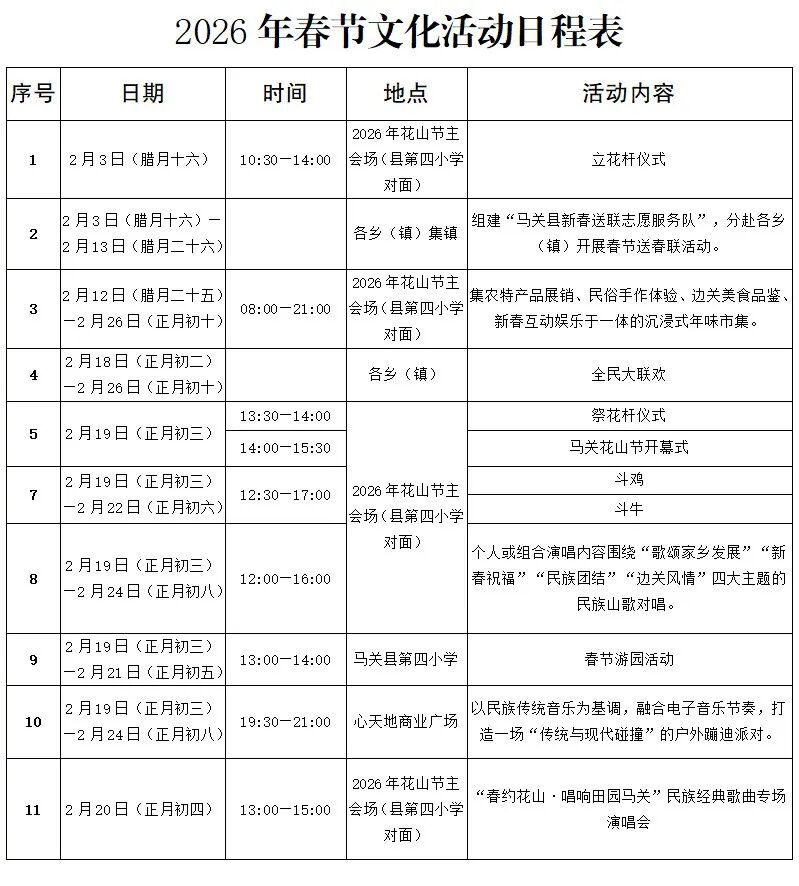 为深入践行文化强县战略,进一步传承和弘扬中华优秀传统文化精髓,丰富全县各族群众的精神文化生活,营造积极向上、开拓创新、喜庆祥和的节日氛围,凝聚各族干部群众团结奋斗、共谋发展的强大力量,同心共筑中国梦,推动马关县经济社会高质量发展,马关县创新举措、系统谋划,推动2026年马关县春节系列文化活动。