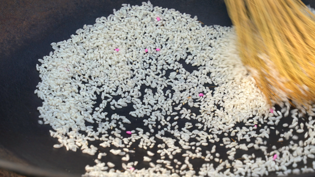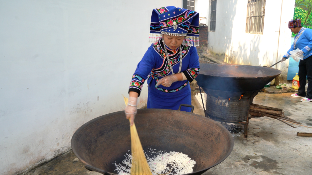 活动现场,妇女们分工协作,精选的糯米先上锅蒸煮至软糯,随后摊开晾晒脱水,再送入机器压制成薄而均匀的扁米。铁锅烧热注油,舀入一两勺扁米,手持稻草扎成的特制工具快速翻炒,伴随着“滋滋”的声响,扁米在热力作用下迅速膨胀,变身成金黄酥脆的米花,这时一股浓郁的米香扑鼻而来。
