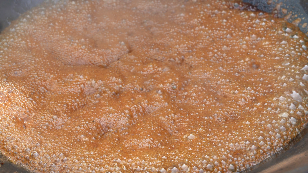 另一边,新榨的红糖块被投入锅中,然后加水慢熬,并不停搅拌,直至糖块完全融化,熬煮出浓稠起泡、色泽红亮的糖浆。这时把滚烫的红糖水趁热浇入炒好的米花中,锅铲翻飞间,糖浆与米花充分交融,每一粒米花都裹满甜香。大家迅速将拌匀的食材压实定型,待其冷却变硬后,用刀划切成大小均匀的方块,一块块香甜软糯的富宁米花就新鲜出炉了!