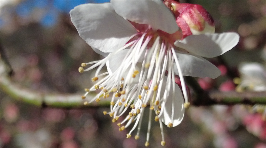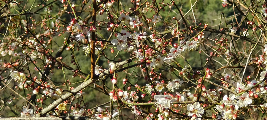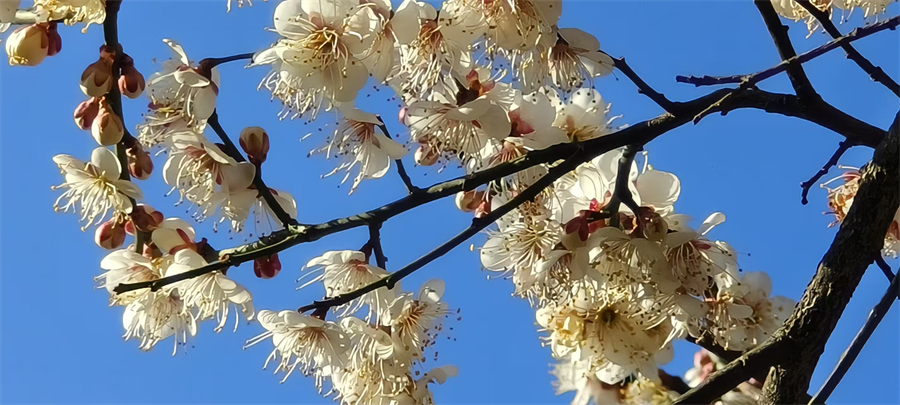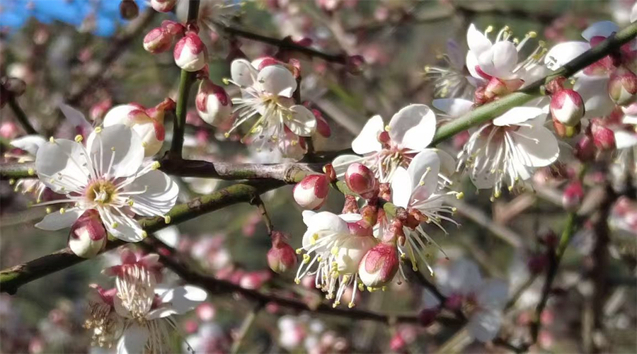 在暖阳的照耀下,山野间的梅林宛如被打翻的调色盘。洁白的花瓣与艳红的花萼相映成趣,有的完全舒展,露出细密的黄色花蕊;有的含苞待放,在枝头攒成点点胭脂色。微风拂过,花枝轻颤,暗香浮动,将山野晕染得诗意盎然。