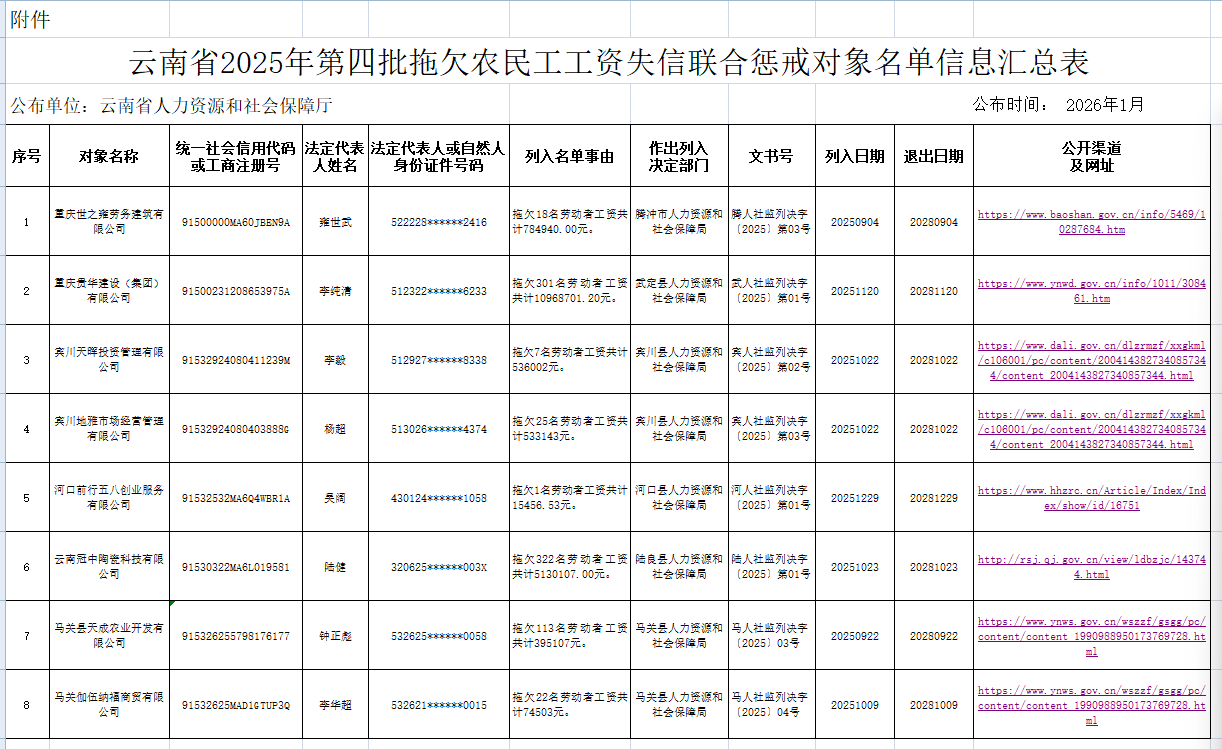 记者日前从云南省人力资源和社会保障厅获悉,为加快推进社会信用体系建设,构建跨地区、跨部门、跨领域的失信联合惩戒机制,依据人力资源社会保障部《拖欠农民工工资失信联合惩戒对象名单管理暂行办法》和云南省人力资源和社会保障厅《关于贯彻落实〈拖欠农民工工资失信联合惩戒对象名单管理暂行办法〉的通知》,现将2025年第四批被各州(市)、县(市、区)列入拖欠农民工工资失信联合惩戒对象名单的单位予以公布。