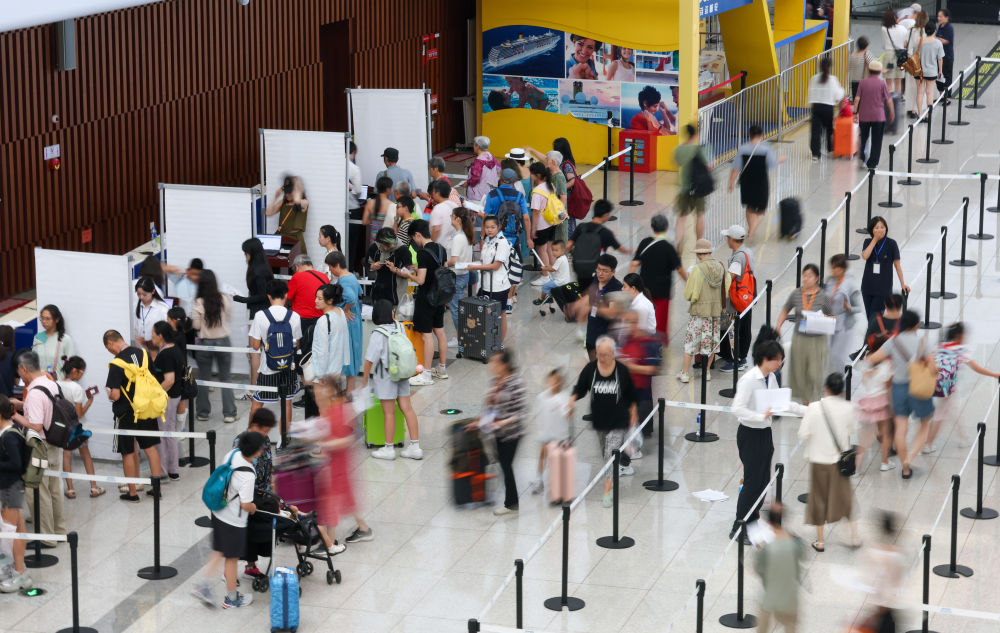 2025年7月23日,旅客在天津国际邮轮母港办理登船手续。新华社记者 孙凡越 摄