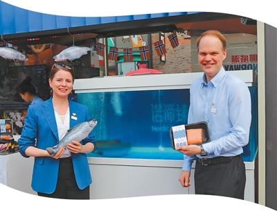 童安睿(右)在“Norway Now挪威潮”市集上,向顾客介绍产自中国东海的养殖三文鱼。