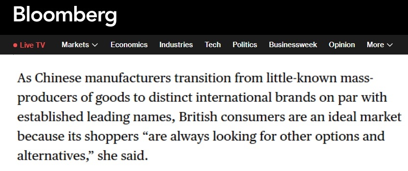 彭博社网站的报道指出,相比美国的贸易保护主义政策,英国对中国贸易持开放态度。报道援引英中贸易协会零售和电子商务部门主管唐赛琳(音译)的观点指出,在英国市场,消费者欢迎任何能提供优质产品和物有所值的优秀品牌。她表示,随着中国制造商从鲜为人知的商品生产者转型为与国际知名品牌比肩的独特品牌,英国消费者成为其理想的目标市场,因为当地买家“始终在寻求更多选择和替代方案”。