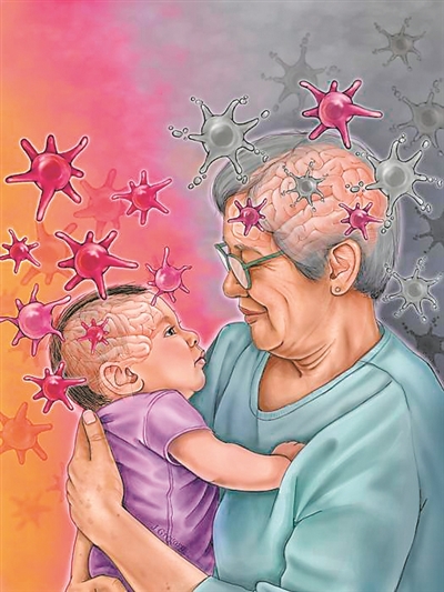 细胞衰老与大脑结构之间存在关联(示意图)。